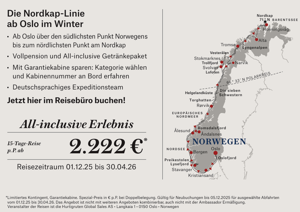 Black Friday-Angebot: ab 2.222€ p.P.* auf der Nordkap-Linie ab Oslo reisen!